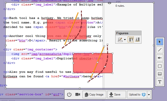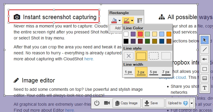 After you are done with editing, just hit upload button: CloudShot will upload your shot to selected storage, and link will be copied to the clipboard. After that you can paste this link to your IM message, email or task manager and share it. Yep, that easy!