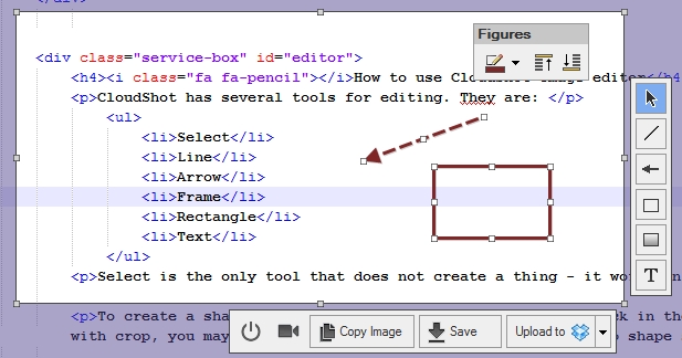 When you make a shot, whole screen is captured. Thus there's no need to rush - take your time and select the area on the screen you want to share, save or copy. CloudShot detects windows, menus and popups - just point element you need to capture and click it - crop area size and position will automatically match highlighted element.